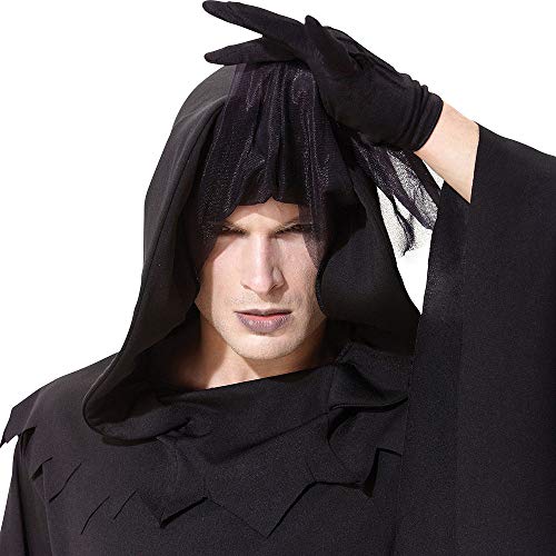 Long, black hooded robe with a detachable face veil and mask-sash (scythe not included)
