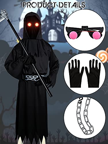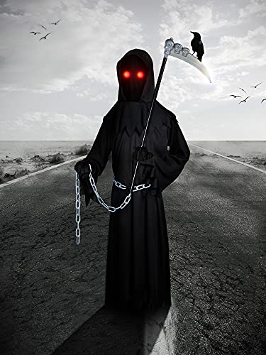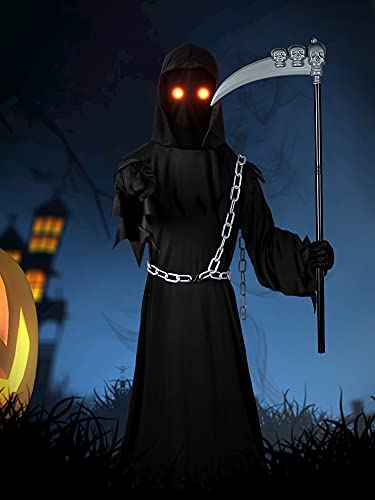 Grim reaper’s costume set: you’ll get ghostly sleeved black robe, black hood, long chain, long pointed finger gloves, glowing red glasses and grim reaper scythe, nice spooky Halloween costume permit you to turn out to be the embodiment of grim reaper in the Halloween